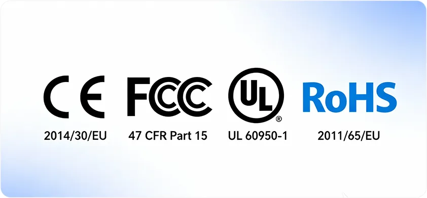 Certified with ISO 9001, ISO14001 UN38.3. Our products pass all authorized tests, including CE, FCC, UL, RoHs and etc ensuring the highest standards of safety, reliability, and global compliance.
